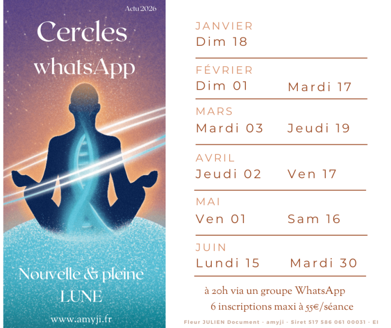 04 Jan Cercles Quantiques Année 2026 Fleur 0 Commentaire Evènements Cercles Quantique Les particularités de ce Cercle Quantique est :D’alléger le Stress de votre Corps avec un équilibrage vibratoire par le son.De favoriser le relachement de votre pression Mentale.De vous retrouver sur la bonne longueur d’onde ! En Distanciel, en groupe WhatsApp.… et sur Réservation Uniquement, Merci.Autres dates bientôt sur ce site. Etiquettes : énergie quantique, éveil quantique, ouverture aux vibrations du quantique, portail d'équilibre énergétique, potentialités des vies.